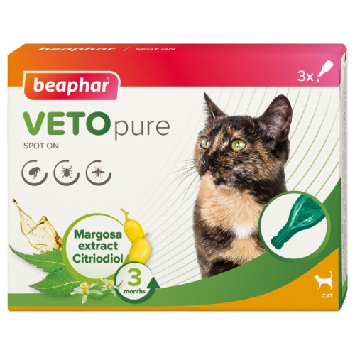 Vetopure spot‐on täpilahus kassidele on välja töötatud välisparasiitide tõrjeks. See sisaldab margoosa (niimipuu) ning tsitrinella ekstrakte, milledel on putukaid peletavad omadused. Kasutusjuhend: Kogus 1 täpilahuse pipett 0,8 ml, Iga 4 nädala tagant. Pipeti ots murda ning selle sisu tühjendada nahale kaelapiirkonda, kõrvade taha. Valgetel kassidel võib preparaat põhjustada mööduva värvimuutuse toote manustamiskohas. Tootel läheb täistoime saavutamiseks mõned päevad. Koostis: Margosa (niimipuu) ekstrakt (CAS 84696‐25‐3) 50 g/l; etüülbutüülatsetamiinopropionaat (CAS52304-36-6) 50 g/l; hüdreeritud, tsükliseeritud tsitronellaõli (CAS 12405629-4) 1g/l; abianeid qs 1l. Ettevaatusabinõud: Mitte kasutada haigetel ega haigusest taastuvatel loomadel ega loomadel, kellel on laiaulatuslikud nahakahjustused. Vältida silma ja ninna sattumist. Silma sattumisel loputada koheselt rohke veega. Kui ärritus püsib, konsulteerida loomaarstiga. Mitte kasutada alla 12 nädalastel kassipoegadel. Pärast manustamist jälgida manustamiskohta regulaarselt, sest tundlikel loomadel võib tekkida kohalik ärritus. Sellistel juhtudel tuleb piirkond pesta õrnatoimelise šampooniga. Pärast kasutamist pesta käed. Välispidiseks kasutamiseks. Mitte alla neelata. Säilitada temperatuuril alla 25°C. Hoiatuslaused: